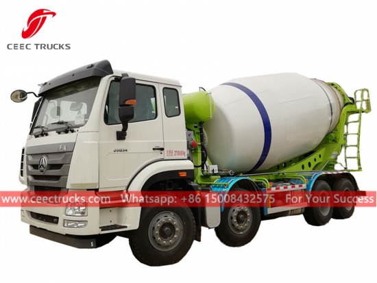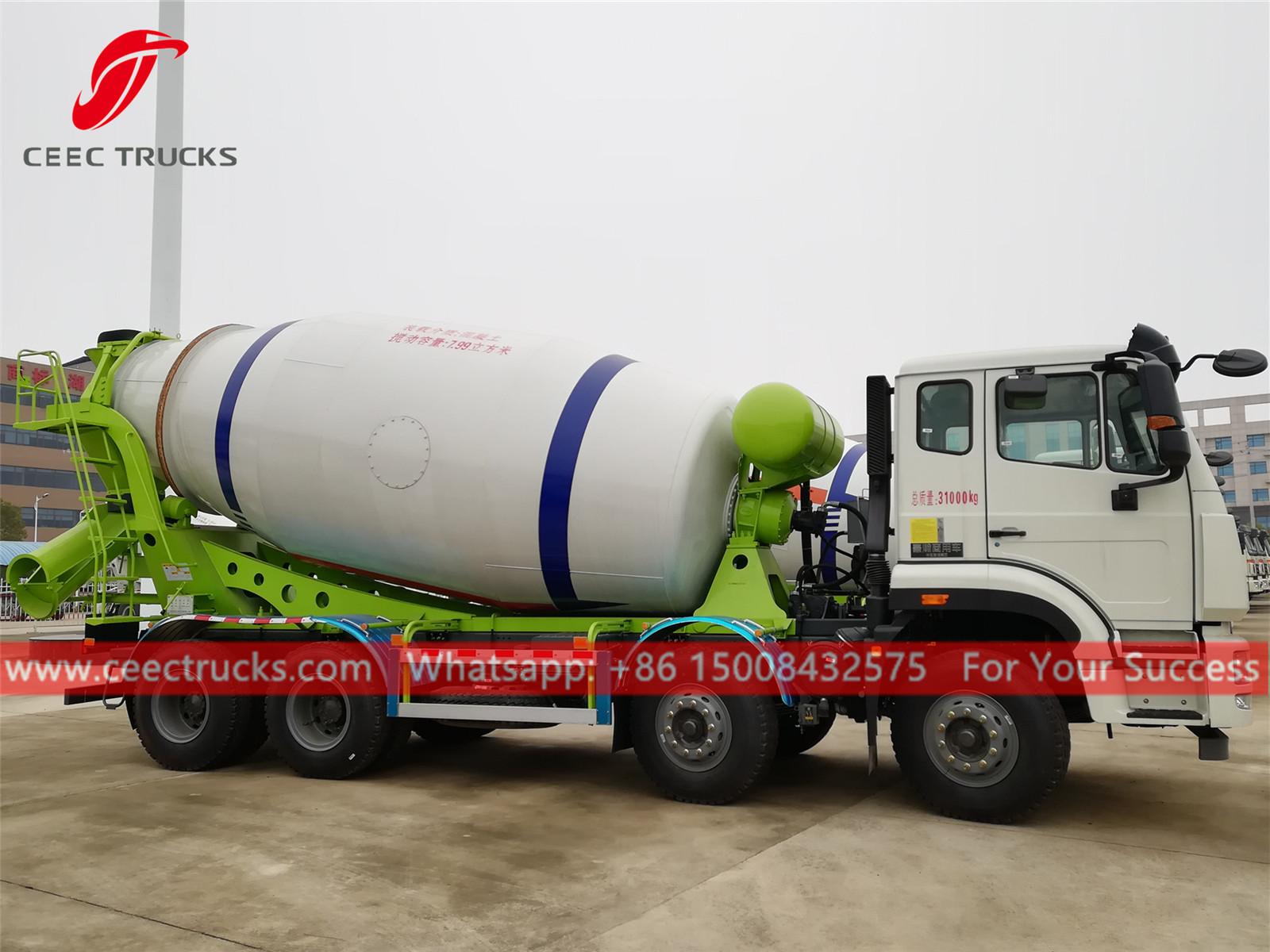 中国重汽 10cbm 混凝土搅拌车,8x4 LHD 底盘,潍柴 340HP 柴油发动机,HW13710L 10 档手动变速箱,主要部件为电机、泵、减速器,可选品牌为 Eaton、PMP、Rexroth、Bonfiglioli 等,喷漆和标识取决于要求。