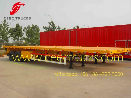 2 轴 40 英尺平板拖车/平台集装箱运输半挂车带转向架,重型转向架悬挂拖车使用 BPW 轴和 JOST 主销和支腿,主要出口肯尼亚、刚果、坦桑尼亚等
