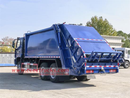 Howo 6x4 20立方米垃圾压缩车基于中国重汽Howo NX 6x4底盘改装而成,轴距为4600+1350毫米。它搭载中国重汽WD615.47发动机(型号HW19710)和10速变速箱。车体为20立方米弧形碳钢压缩垃圾桶,经防腐防锈处理,配备全密封后盖和悬挂式翻斗机构。垃圾的装卸由CAN总线电子控制系统控制,具体通过三个控制点实现:驾驶室内的电子控制箱、驾驶员侧的手动液压操作杆和尾门上的电子控制箱。