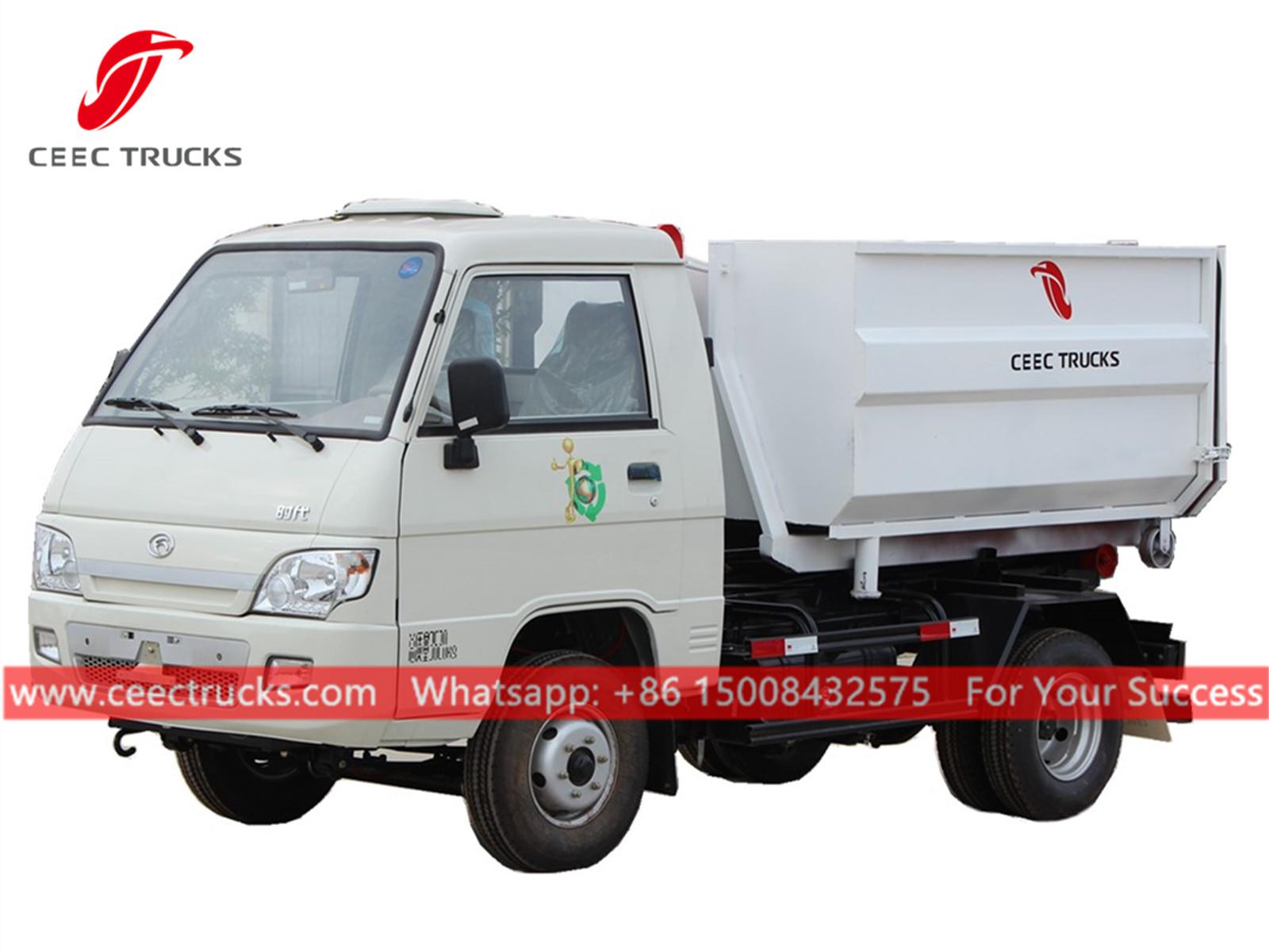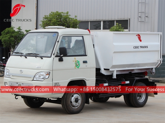 迷你2立方米钩式垃圾车,福田4x2底盘,68马力柴油发动机,5档手动变速箱,高强度钩式装载系统,可选配各种垃圾箱。所有喷漆和标识均根据客户需求定制。