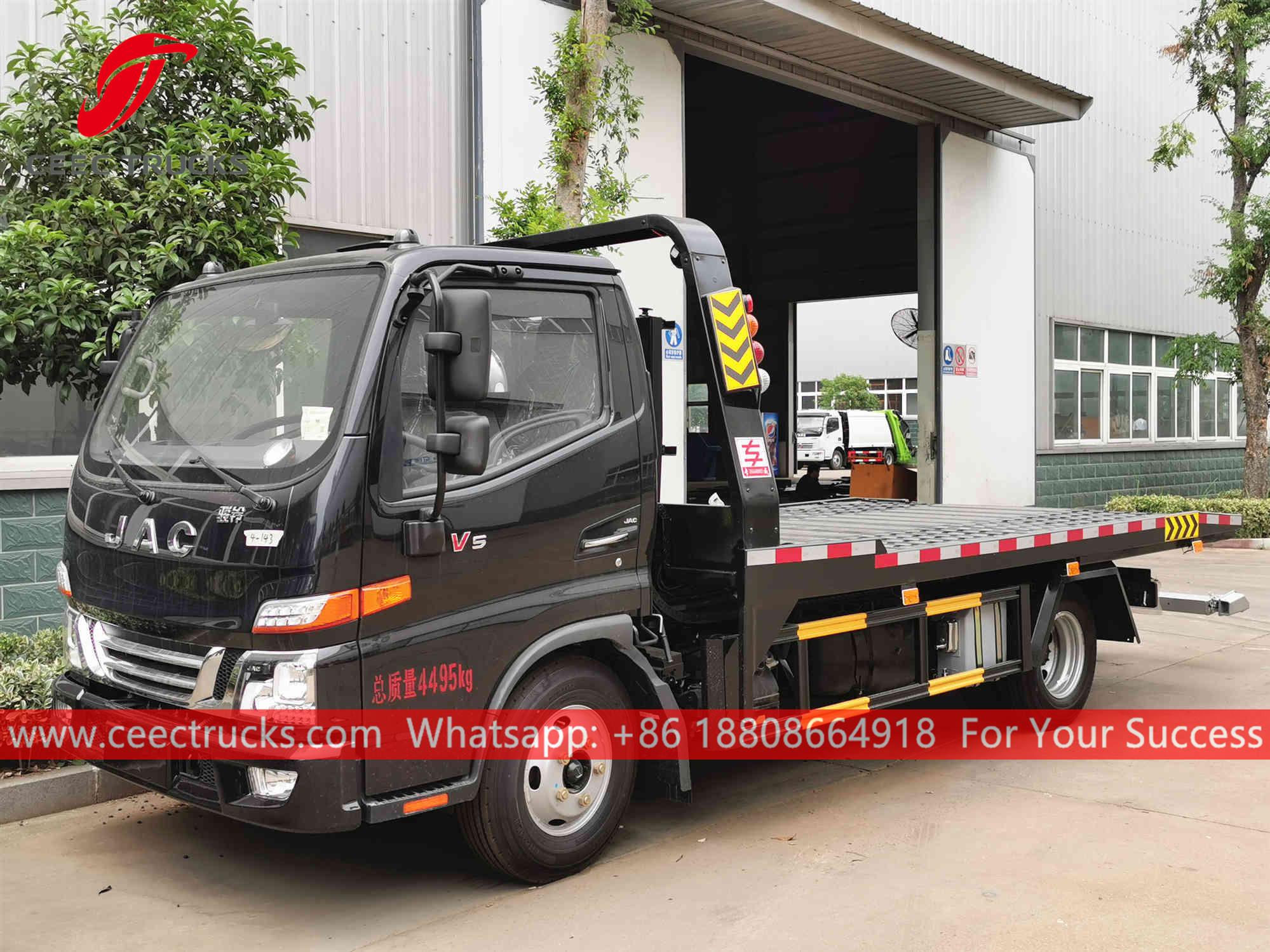 优质 3 吨道路清障车,JAC 左侧驾驶型号 4x2 底盘,5 档手动变速箱,110HP 柴油发动机,长平台带液压缸工作,喷漆和标识取决于要求。
