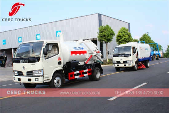 东风牌道路清扫车,采用东风汽车3300mm底盘,左舵和右舵可选,朝柴95马力柴油发动机,5档手动变速箱,配备4立方米不锈钢物料罐车,其中3.5立方米粉尘罐和0.5立方米水罐。各种喷漆和标识可根据客户要求定制。