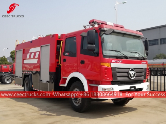 福田 5CBM 水罐消防车,采用福田左侧驾驶型 4x2 底盘,7 档手动变速箱,康明斯 210HP 柴油发动机,水罐车容量 5000 升,喷漆和标识取决于要求。