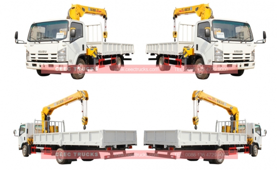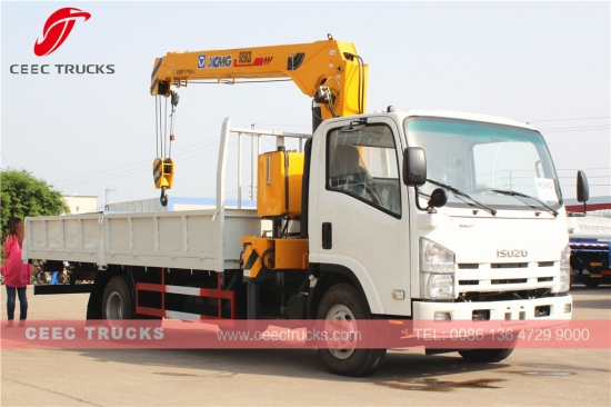 五十铃低价 5T 伸缩臂起重机卡车出售,五十铃技术柴油发动机 190HP,手动 MLD 6 档变速箱,操作简便,配备 5000kg 伸缩臂起重机,也有遥控器可供选择,货箱长度范围从 3000mm 到 4500mm