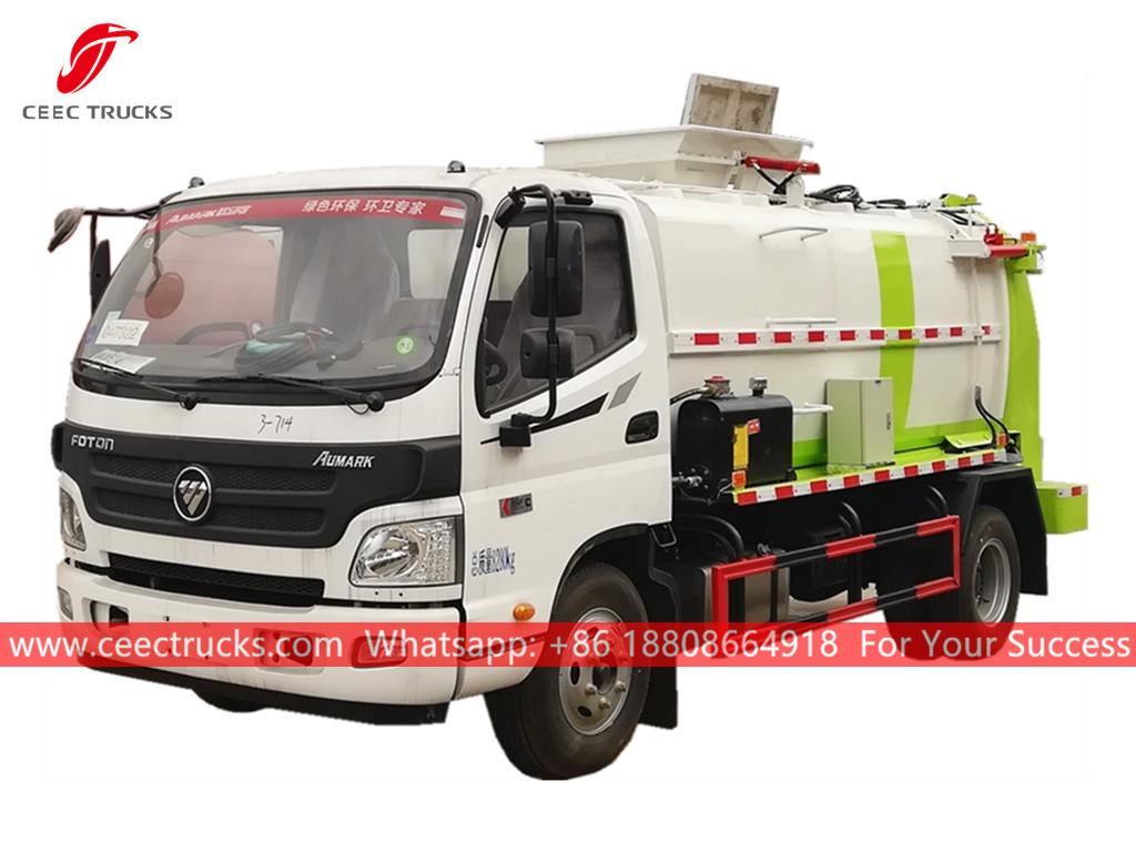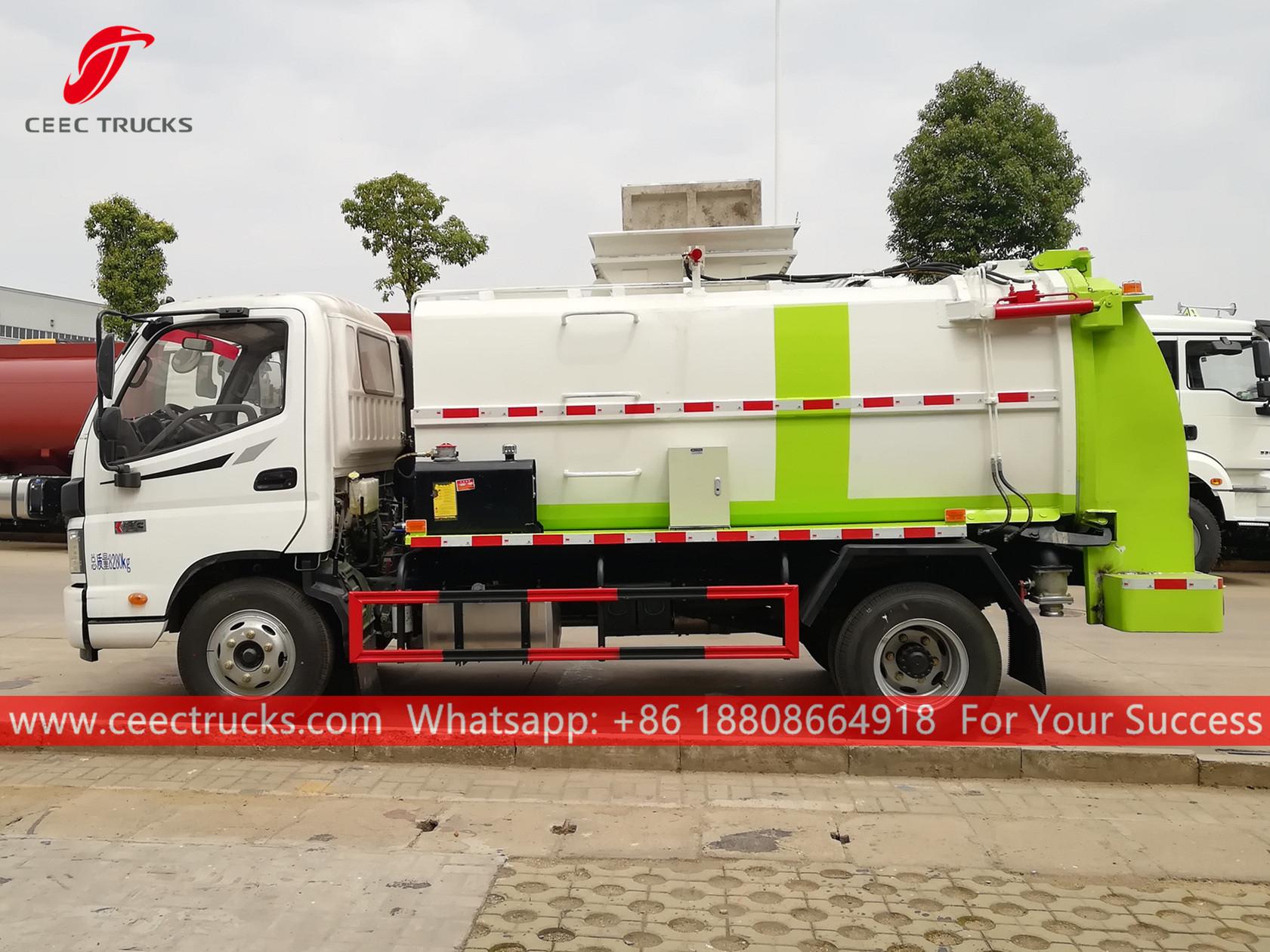 福田6cbm厨房垃圾收集车,福田4x2底盘,手动5档手动变速箱,康明斯142HP柴油发动机,自动侧举装置,配备液压后门,喷漆和标识根据要求而定。