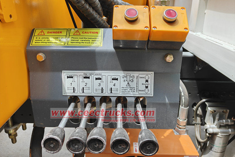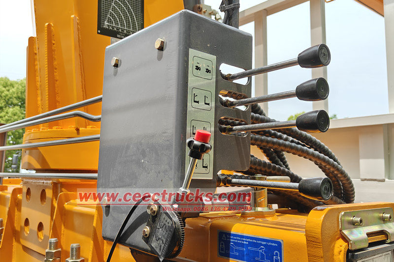 ● 伸缩臂操作: 4节动臂通过液压油缸逐节伸长,伸长作业半径可达16米,动臂末端装有滑轮组及钢丝绳,可起吊重物。