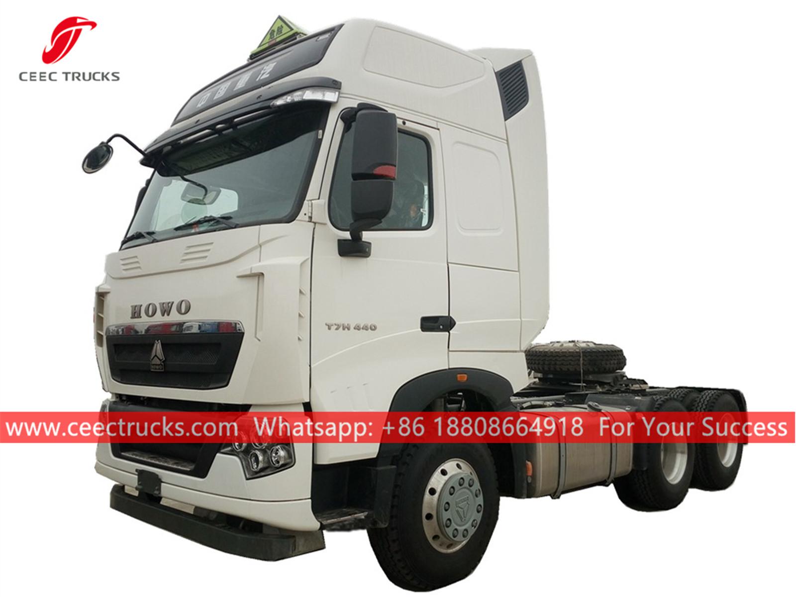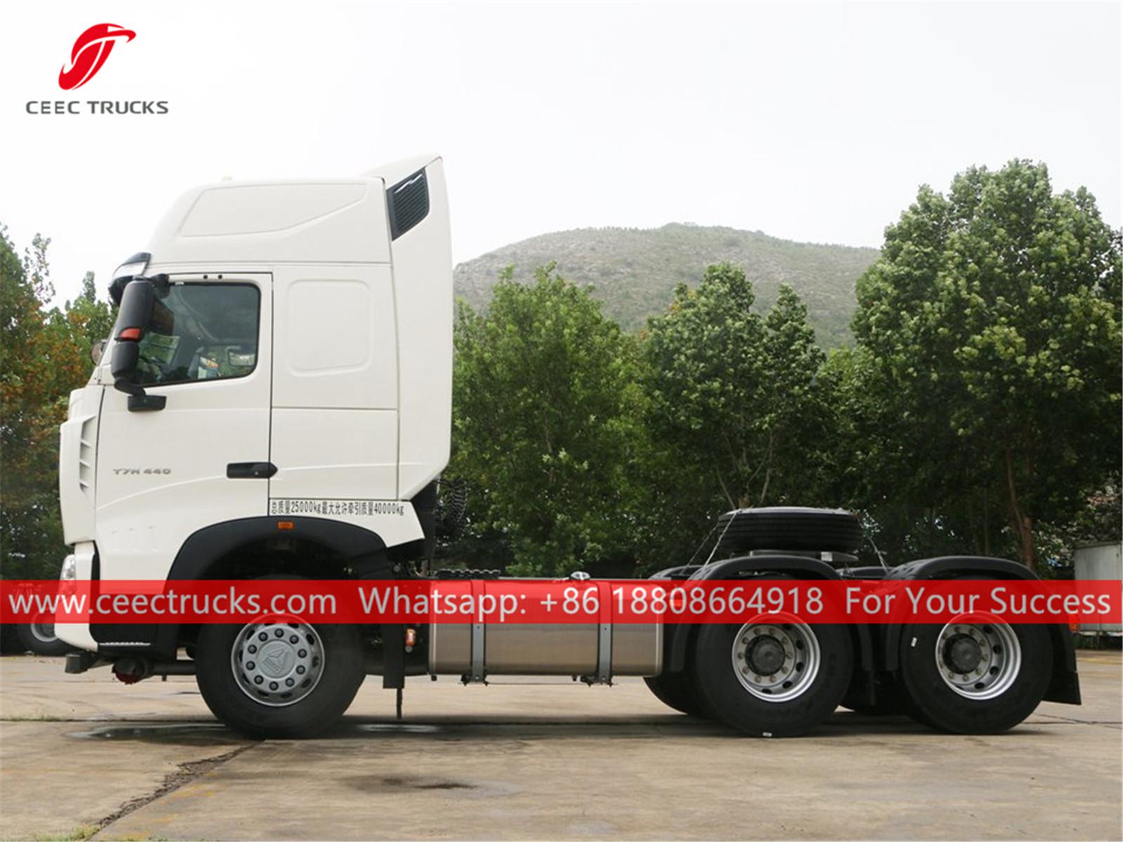 HOWO 6x4 prime mover, SINOTRUK 440HP diesel engine, SINOTRUK 16-shift manual gearbox, maximum towing weight can be up to 40Tons, painting and logos depend on requirement.