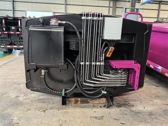 后部料斗: 后部配备有铲斗和滑板,使垃圾车成为后装式垃圾车,内部装有铲斗和滑板,用于收集垃圾,也可以向上提起进行垃圾卸载。