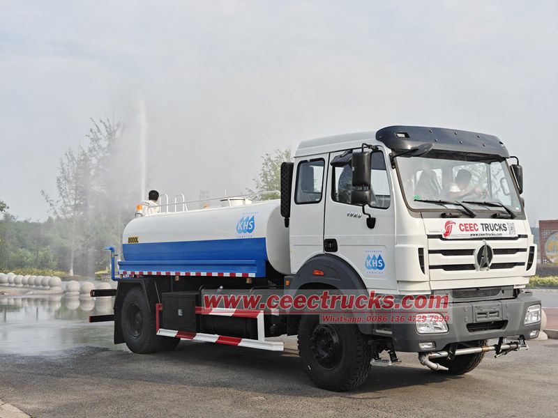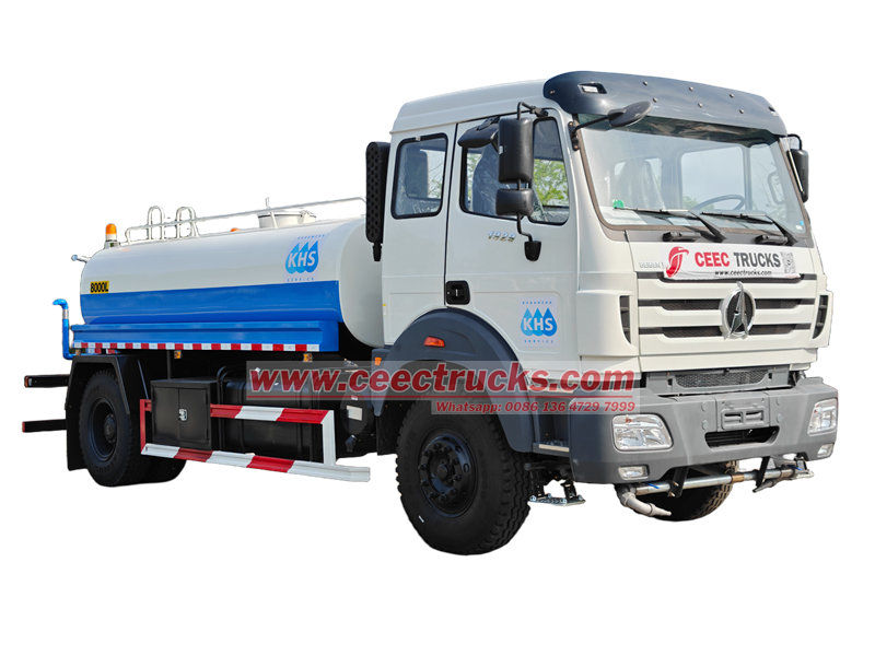 4X4, RHD drive type avaiable北奔10方洒水车是城市环卫、市政工程专用作业车辆,集储水、运水、喷洒等功能于一体。该车配备大容量碳钢罐体、高压水泵及可调式喷嘴系统,支持侧喷、后喷、高压枪喷等多种模式。 北奔洒水车 用途广泛,不仅可以通过雾化喷洒抑制道路扬尘、净化空气,还能在高温下对路面进行降温;还可以用于绿化带灌溉、施工现场降尘、应急消防、道路冲洗等,是保障城市清洁、维护生态环境的“多面手”。