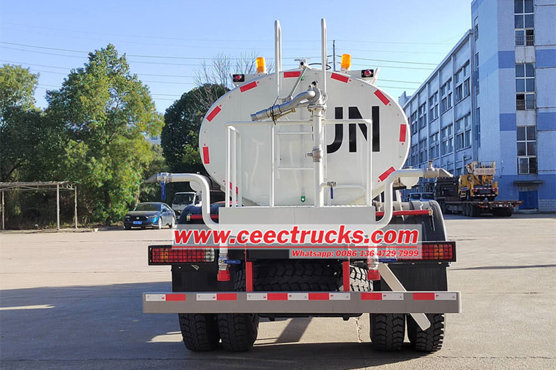 北奔四驱洒水车具备运水、排水、应急消防等功能,配置前冲、后洒、侧喷,自吸式专用水泵,可抽水、排水,配有消防接头、自流阀,罐体后置工作平台,安装绿化洒水炮,炮身可旋转,可调节水量(柱状、雾状、毛毛雨状)。