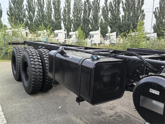 北奔 6x6 全轮驱动底盘采用北奔 NG80 2638AP 型驾驶室,为全轮驱动,轴距为 4450+1450mm,配备潍柴 WP10.380E32 发动机、快思 9 速变速箱、7 吨前桥、18 吨后双桥、12.00R20 轮胎,最高时速为 90km/h。