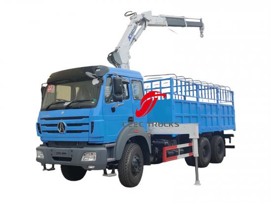 5 吨北奔 2638 载货车,北奔 6x4 右侧驾驶底盘,法士特 12 档手动变速箱,潍柴 380HP 柴油发动机,徐工 5 吨折臂起重机,货厢尺寸可选,喷漆和标识取决于要求。