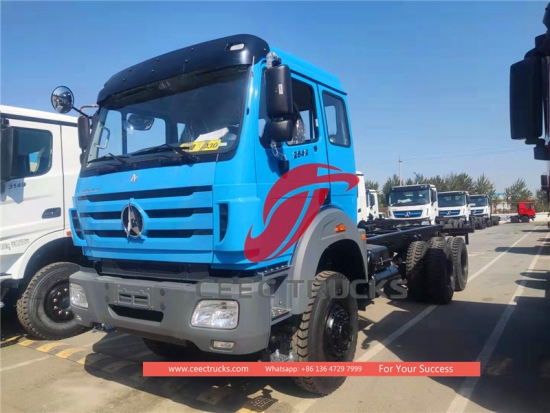 北奔2642卡车底盘,6*6驱动,带越野系统,著名品牌潍柴420马力柴油发动机,12JS200T极其可靠的变速箱,4450+1450毫米轴距,重型加强型4 U型螺栓悬挂系统,梅赛德斯奔驰技术的前桥和后桥,奔驰技术NG80B驾驶室。