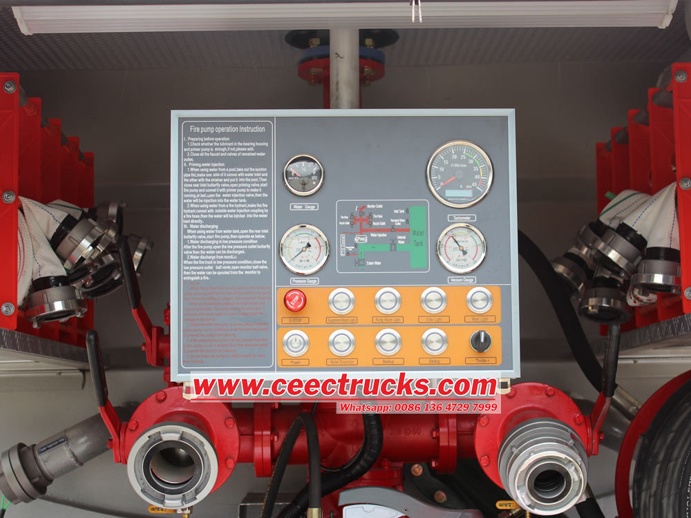 水泵操作面板英文,挡泥板应为黑色,带报警灯,可拆卸爬梯,车身后部设备箱下方向向上倾斜约45度,车辆所有接口及配件均为英制,带30m卷黑色高压软管 |