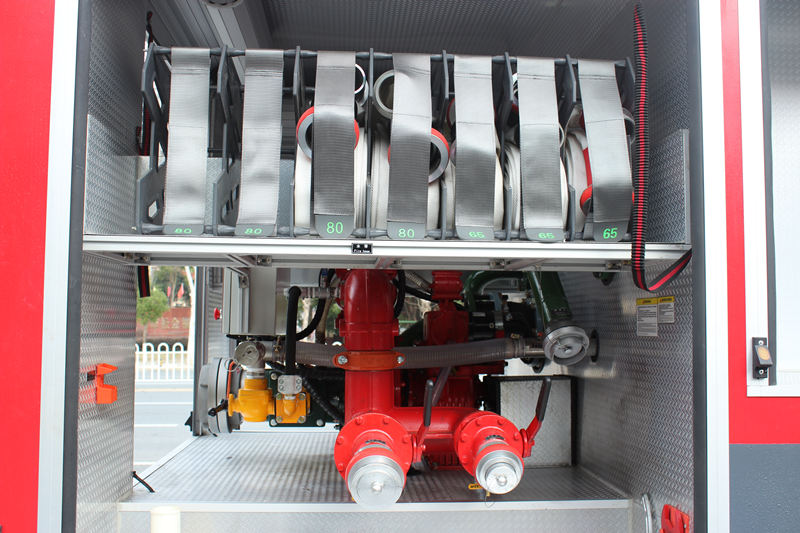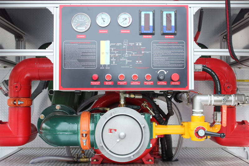 â–² 消防泵系统:该车配备高性能CB10/60消防泵额定流量高达60L/s,最高工作压力1.232MPa,确保远距离、大流量供水需求。水泵采用双级离心式设计,自吸能力强,运行稳定,在7米吸深条件下,可快速建立稳定水压。