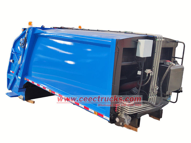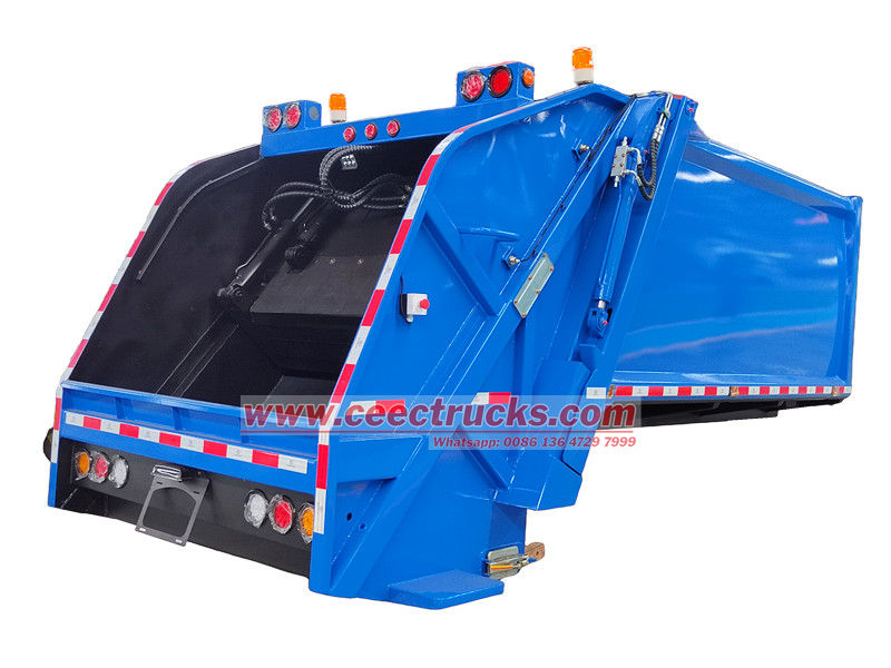 Volume optional 5-20cbm这款定制的10立方米后装式垃圾车车厢集高效收集、强力压缩和密封运输于一体。密封车厢采用高强度耐磨钢材制造,配备液压驱动的装载和推料机构,可自动破碎垃圾并进行高密度压缩。