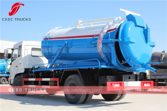 东风10000L化粪池清空器,康明斯170HP柴油发动机,6档手动变速箱,高强度钢材料罐车可达10立方米,威龙真空泵,液压升降废物排放装置,喷漆和标识取决于要求。