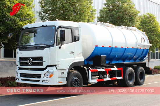 制造销售东风16000L化粪池清空器,采用美国康明斯210HP柴油发动机,8档手动变速箱,高强度钢材质罐体最大容量可达16cbm,标配威龙真空泵,液压升降装置用于罐体升降,喷漆和标识可根据要求定制。