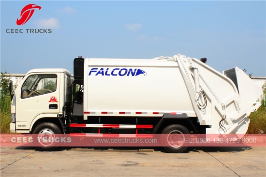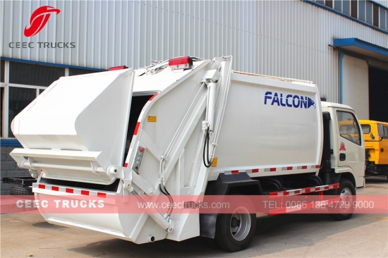 低价东风 5 立方米垃圾压实车,采用优质 95HP 柴油发动机、5 档手动变速箱、高强度钢材料垃圾压实车罐车,容量可达 6 立方米,德国 PLC 控制,操作简便,所有喷漆和标识均根据要求而定。