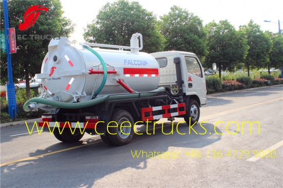 东风 4000 升污水真空卡车出口厄瓜多尔,DFAC 3300mm 轴距 LHD 底盘,95HP 发动机出售,5 档手动变速箱轻松驾驶。4000 升碳钢污水罐车,厚度超过 5mm,防腐涂装和标识取决于要求。