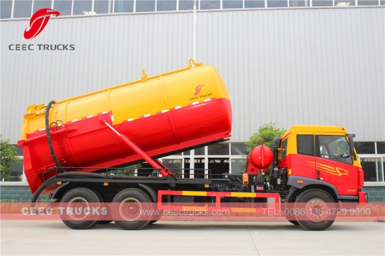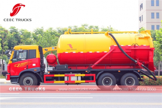 一汽18000L真空吸污车,采用一汽品牌220HP柴油发动机,手动9档变速箱,高强度钢质材料罐车最大容量可达18cbm,标配威龙真空泵,液压升降装置用于罐体升降,喷漆和标识根据要求而定。
