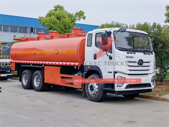 出售一汽25000升燃油运输车,采用一汽6×4左舵底盘,9档手动变速箱,潍柴260马力柴油发动机,标配油罐车,并标配知名品牌燃油泵。所有喷漆和标识均根据客户需求定制。