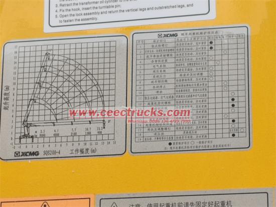 上部配备徐工MSQS200-4四节直臂起重机,最大起重量8吨,起重力矩20t · m.核心参数如下: