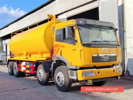 热销型号 25m³ 真空吸污罐车,采用一汽 8*4 RHD 底盘,380HP 超强力发动机,12 档手动变速箱,高强度碳钢材料罐车,厚度超过 6mm。可按要求喷漆和标识