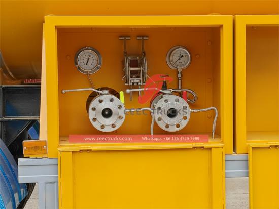 3轴带BPW桥(13T),12R22.5 12PR(13个),JOST主销,JOST支腿(25T),机械式液位计,双压力表,双温度计,双紧急切断阀,四球阀,双安全阀,两个工具箱,单出口,双装卸系统,铝制遮阳保护,2套9kg ABC型灭火器,1套2kg CO2型灭火器,3套危险标志牌,2套橙色数字牌,带打印机的流量计 |