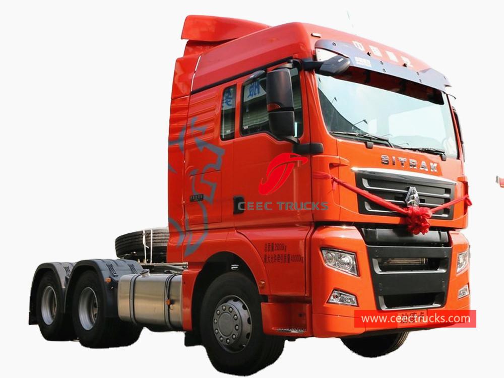 中国重汽豪沃6x4牵引车,中国重汽371马力柴油发动机,10档手动变速箱,最大牵引重量可达40,000kg,喷漆和标识根据要求而定。