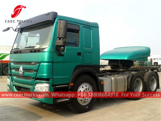 中国重汽豪沃6x4牵引车头,中国重汽371马力柴油发动机,10档手动变速箱,最大牵引重量可达40,000kg,喷漆和标识根据要求而定。