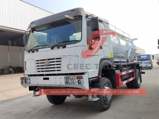 HOWO 4×4真空罐车 (也称为豪沃 4x4 真空污水车、下水道吸污车、豪沃 4x4 污水车、沟渠清空器、化粪池车、化粪池清空器) 用于收集、输送和排放污水、污泥、化粪池、原油等液体,以及小石子、砖块等固体物质。适用于下水道、化粪池、化粪池、沟渠等的清理。广泛应用于环境卫生领域。