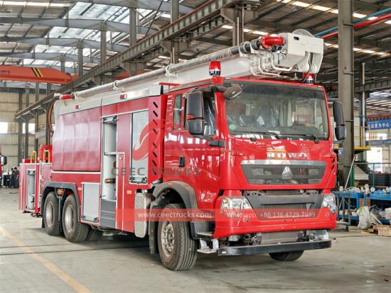 8000L stainless water tank,32m high reach extendable turret豪沃6x4高 抵达 消防车结构紧凑、体积小、操作适应性强、操作灵活,具备高低空救援和灭火功能。采用豪沃重型6x4底盘,动力强劲,配置先进。取样器 为底盘原厂动力输出装置,动力匹配最佳。副车架采用大截面箱形结构,抗扭性能好,支腿采用短跨度H型结构,动臂采用折叠臂组合,动作迅速平稳。回转部分配备中央回转接头,可实现360度无限位回转。 豪沃消防车,带高伸展式炮塔 有大流量消防泵及消防炮。水箱及水路均采用优质不锈钢及高强度铝合金管。液压系统采用高性能泵及电液比例控制方式。电气系统采用成熟可靠的控制器CAN总线通讯技术,多点集中操作。