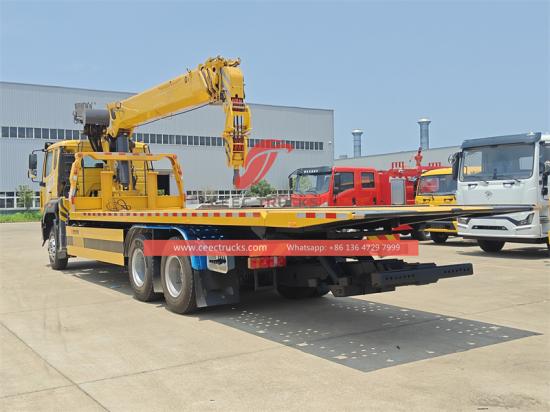 This Howo flatbed tow truck with 8T crane is a versatile and well-designed special truck. It is equipped with a diesel engine of Chinese brand Yuchai Engine, with a strong power of 260HP, which can meet various work needs. The new M9 luxury cab can accommodate three people and is equipped with air conditioning, providing a comfortable driving environment for drivers and operators. The crane is a telescopic boom with a maximum lifting capacity of 8000kg, 360° full rotation, and a maximum lifting height of 16.5m. The crane designed by CEEC factory weighs 1850kg and has an installation space of 1350mm, which is light and space-constrained. At the same time, the crane truck combines the flatbed tow system, with a load capacity of 12-15tons, providing more possibilities for engineering operations. The control panel can be selected in English or other languages, which is convenient for users with different needs. Howo cargo crane truck also provides a variety of optional configurations, such as folding arm boom, hydraulic dump box, customized box thickness and height according to needs, and optional remote control box.