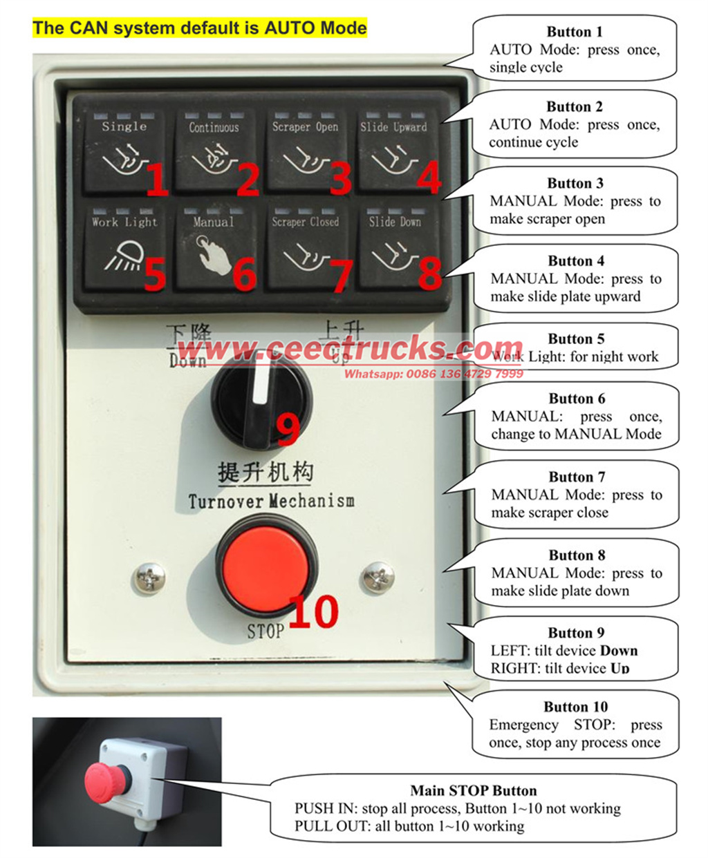 操作系统:包括 CAN 电气控制系统(驾驶室内的主控制箱和后挡板侧面的后控制箱)和液压操纵杆控制系统,这有助于实现所有特殊功能的转换。