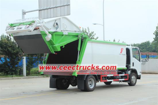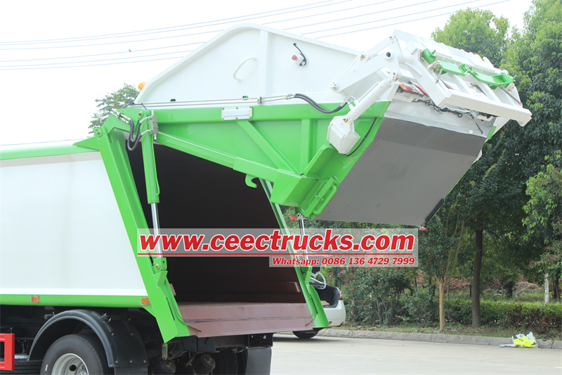 Rear loader hopper for 240L and 1100L bins五十铃垃圾压实车采用日本五十铃NPR卡车底盘改装,采用T420高强度特种钢压缩箱车身,车身侧面厚度4mm,底板厚度4mm,箱体轻巧坚固,全密封设计确保垃圾在压缩、装载和运输过程中始终保持密闭状态,有效防止二次污染和异味散发。压缩比超过2.5,相同箱体容积可容纳更多垃圾,运输效率显著提升。尾箱容积不低于0.8立方米,配合快速卸料系统,卸料时间最快不超过45秒,大大缩短垃圾处理周期。在操作方面,五十铃 NPR 后装载压实卡车支持手动、自动两种模式变速箱,适应不同的操作场景,提升操作的灵活性和便捷性。