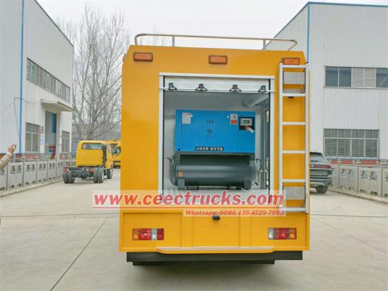 3、大功率供电系统:五十铃流动救援消防车配备进口日本本田SHT11500型号发电机带控制柜,可提供11.5kw电力220V、380V,可满足大量用电设备同时工作的需要。