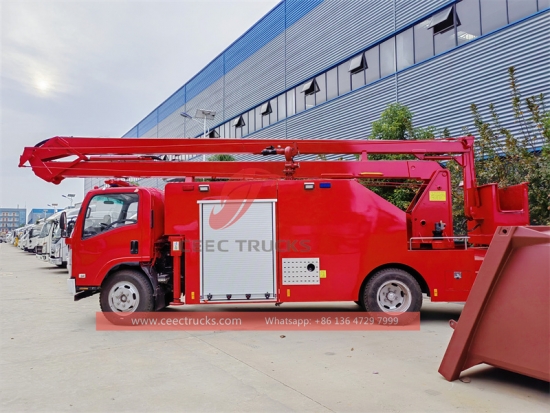 五十铃 700P 高梯消防救援车,五十铃 ELF 左侧驾驶型号 4x2 底盘,MLD 6 速手动变速箱,五十铃 190HP 柴油发动机,喷漆和标识取决于要求。