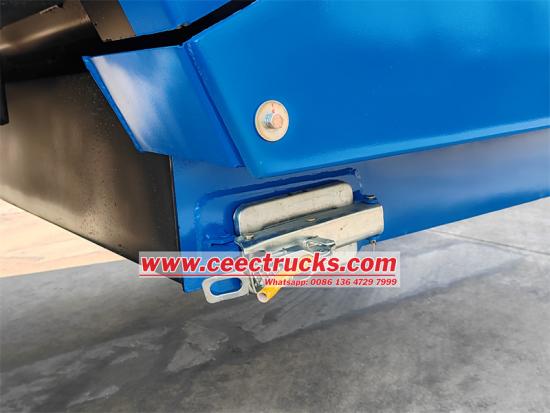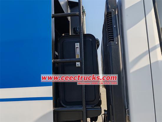 中电环保此次运输的五十铃700P后装压缩车,采用4*2驱动底盘改装,轴距4175mm,搭载4HK1-TCG61发动机,190马力,排量5193ml,4缸直列涡轮增压中冷设计,匹配MLD六速变速箱,最高时速105km/h。垃圾箱容积10立方米,采用弧形整体钢板制成,底部和侧板均为4mm厚Q235特种钢,压缩比达到1:3.4。垃圾装卸系统采用PLC全自动控制。