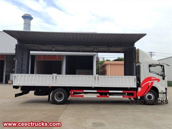 五十铃 Giga 4x2 205HP 6 轮翼式厢式货车,又称翼式厢式货车,是对普通厢式货车的改进。它是一种可以通过动力弹簧、手动装置或液压装置打开车身两侧翼子的特种车辆。该车的顶部、前面板和后门结构与铁制瓦楞厢式货车相同,侧面由翻板、上侧板和下侧板组成。