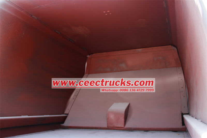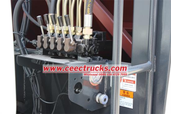 Rear tilting device for 240L and 1100L bins五十铃六轮市政后装载式垃圾车也可以称为五十铃NKR 6cbm垃圾压缩机垃圾车, 哪个是一个强大的专业人士垃圾处理车。中电卡车生产的五十铃6立方米后装式压路机搭载五十铃4x2 ELF 600P底盘,五十铃120马力4KH1柴油发动机,符合欧6标准,排量2999毫升,轴距3360毫米,2+1座椅,车内空调,气刹系统带ABS,直列4缸4冲程柴油发动机,方向助力。该车有三种操作模式:驾驶室内CAN-BUS电控、液压操纵杆、后尾箱CAN-BUS电控箱。
