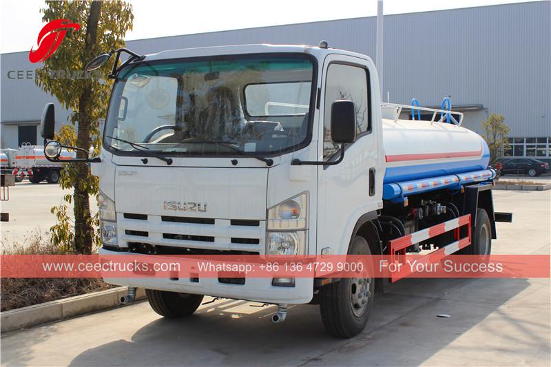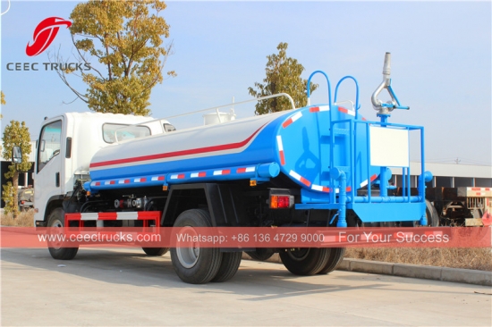 缅甸五十铃7000升水罐车,五十铃4x2左舵车型底盘,MLD六挡手动变速箱,五十铃技术190马力柴油发动机,名牌水泵,可选配前、中、后喷嘴。所有喷漆和标识均按要求定制。