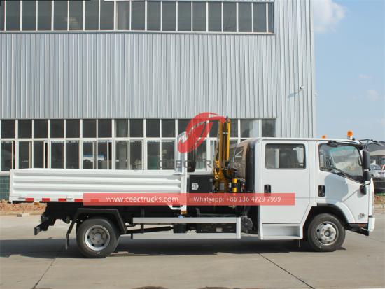 Equipped with XCMG loader crane这 五十铃 ELF 190HP 货运卡车起重机 是一款动力强劲、设计精良的卡车,在运输和起重作业中具有绝对优势。五十铃NPR起重卡车搭载五十铃品牌柴油发动机,动力强劲,可达190马力,可满足快速作业的需求。双排驾驶室可容纳5人,并配备空调,为驾驶员和工作人员提供舒适的驾驶环境。五十铃NPR双驾驶室起重卡车的上部配备折叠臂起重机,最大起重量5吨,最大起升高度11米,全回转520°。起重机自重950公斤,安装空间850毫米。同时,货箱具备自卸功能,控制面板可选英语或其他语言,方便不同需求的用户使用。五十铃NPR货物起重卡车还提供多种选装配置,例如伸缩臂、抓斗臂、篷布货箱、根据需要定制的货箱厚度和高度以及远程操作控制箱。