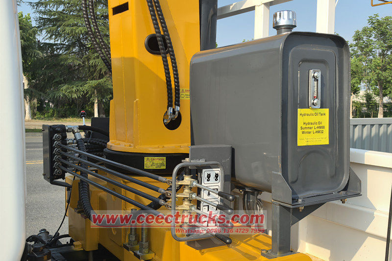 这款五十铃动臂起重机由动臂、转盘、车架、支腿等几个关键部件构成。车载起重机可进行变幅、伸缩、回转、卷扬等机械运动,并通过这些动作的协调组合实现起重作业。