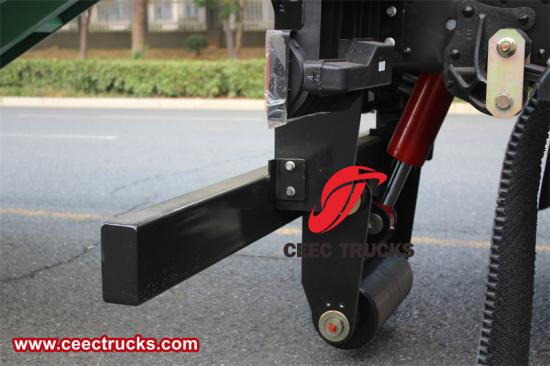 步骤3. 当臂钩勾住箱体钩时,继续将臂操作手柄向下推至下降位置,以使垃圾箱继续装载到车辆上(注意:确保垃圾箱的纵梁位于附着架尾部两个后滚轮之间);