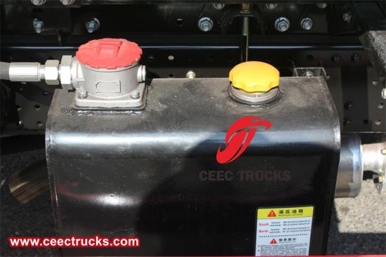 液压油泵及操作阀、平衡阀、液压锁、钩臂主操作油缸、套臂滑动油缸、液压油管、液压油箱、液压加强后支腿。 操作方式:手动、无线遥控操作。 哦一个翻斗车箱, |