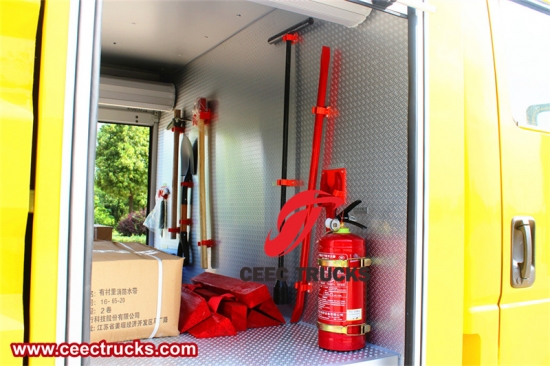 驾驶室顶部装有报警旋转灯,配备消防器材,及随车工具。 |