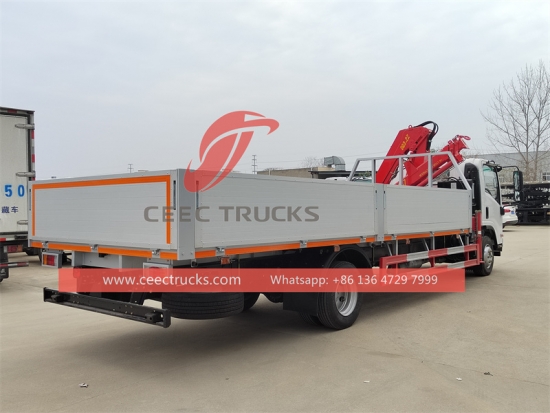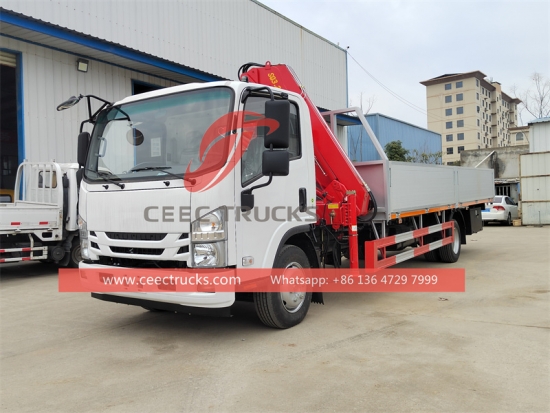 五十铃 5 吨动臂起重机卡车,五十铃 NPR 4×2 左侧驾驶底盘,MLD 6 档手动变速箱,五十铃 190HP 柴油发动机,中国知名品牌 5 吨折臂起重机,货厢尺寸按要求,喷漆和标识取决于要求。