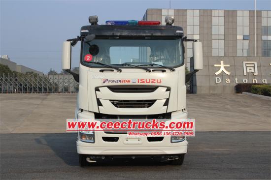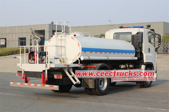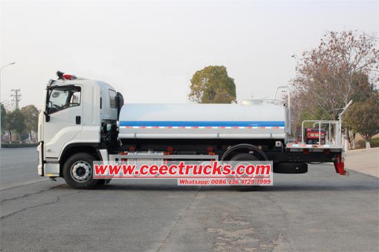 五十铃FTR 10000升洒水车采用五十铃FTR GIGA 4X驾驶室4500mm轴距底盘改装而成,搭载五十铃4HK1-TCG60柴油发动机和MLD 6档变速箱。车辆上部为10立方米椭圆形碳钢水箱,配备威龙80QZF-60/90S水泵。罐体两侧设有管路收纳箱,罐体后部为工作平台,配备高压喷水枪和JBQ5.5/9.0移动式消防泵组该车设有3种洒水方式:前洒水嘴、后洒水嘴、洒水炮。