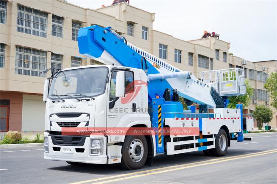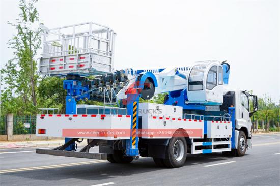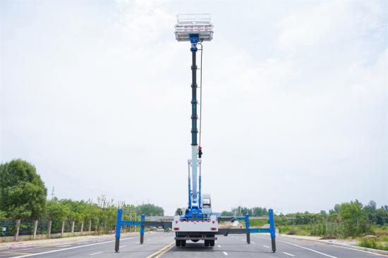 7-section fourteen-sided synchronous telescopic arm五十铃FTR 45米高空作业平台是一款集卓越的技术性能和安全设计于一体的专业工程专用卡车。 该车基于五十铃新款GIGA FTR底盘,搭载4HK1-TC60发动机,最大输出功率205马力,整车质量18000公斤。五十铃FTR高空作业车最大作业高度45米,平台离地高度27米,最大作业半径7米,并配备液压静平衡系统,确保车辆稳定性。